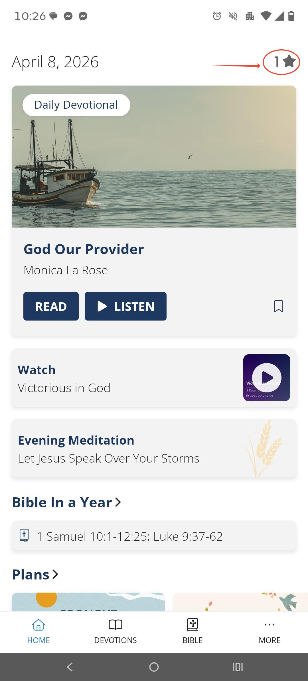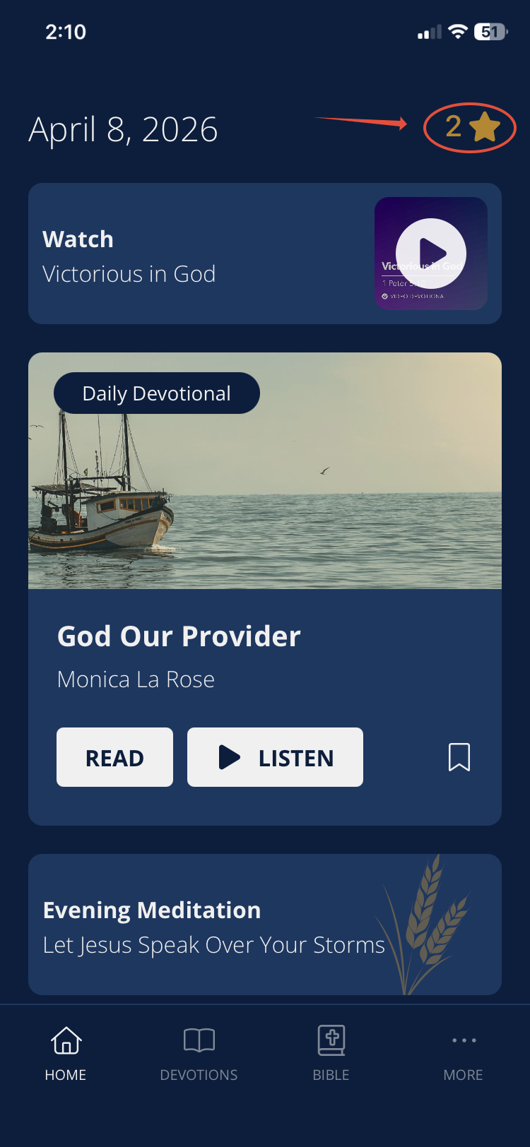 - After reading, the left side of the tile will have a fully filled in gold star. If the star isn't gold, your reading for the day was not tracked and you should go back into the devotional. You will need to be in the devotional for 5 seconds for the reading streak to count.
