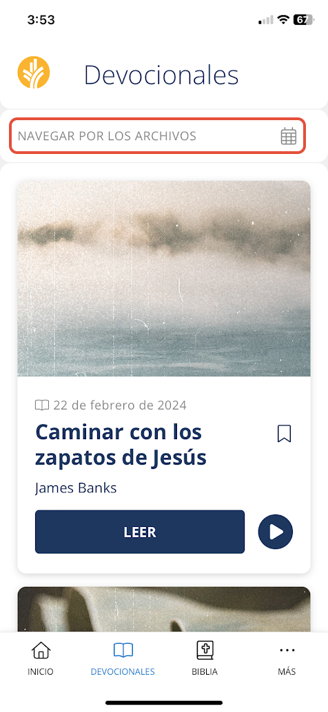 Para acceder a los devocionales pasados usas la opción del calendario desplegable para volver a la fecha que deseas ver.